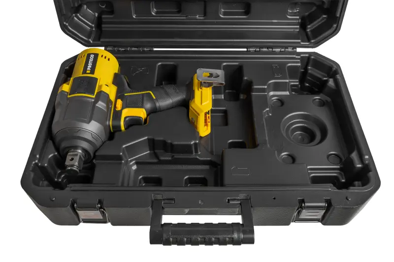 Vďaka 20 V akumulátorovému pohonu odpadá nutnosť pripojenia k sieti, čo poskytuje maximálnu voľnosť pri práci, bez káblov a bez závislosti od elektrickej siete. Akumulátor je navyše možné použiť aj pre ďalšie nástroje v systéme PROTECO AKU PROGRAM. Súčasťou balenia je praktický kufor, do ktorého je možné uložiť uťahovák spolu s dvomi akumulátormi (s kapacitou až 8000 mAh) a nabíjačkou. Kufor zaisťuje bezpečné skladovanie a jednoduchý transport. Pre rýchlu manipuláciu na pracovisku je uťahovák vybavený aj prackou, vďaka ktorej ho možno pripnúť napríklad k opasku.