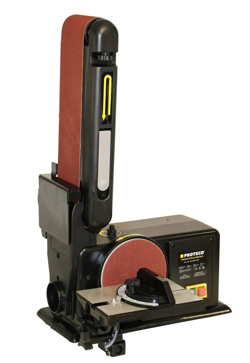 Brúska pásová Proteco je brúska, ktorej služieb využijú nielen kutilovia. Brúska stolová pásová kombinuje pásovú brúsku a kotúčovú brúsku v jedinom zariadení. Je určená na obrusovanie a leštenie výrobkov z dreva a kovu. Na brúske vďaka svojej masívnej konštrukcii možno opracovávať aj väčšie kusy výrobkov. Brúsny pás vďaka polohovateľnému ramenu možno prevádzkovať vo zvislej aj vodorovnej polohe, ale aj v akomkoľvek inom uhle medzi nimi. Stôl brúsneho kotúča možno tiež nakloniť v ľubovoľnom uhle do 45 ° C. Telo brúsky je vyrobené z liatiny. Pohyb brúsnych nástrojov zaisťuje plochý ozubený remeň s remenicami z hliníka. Oba brúsne nástroje možno ľahko meniť. Súčasťou balenia je aj uhlovacie pravítko stola.