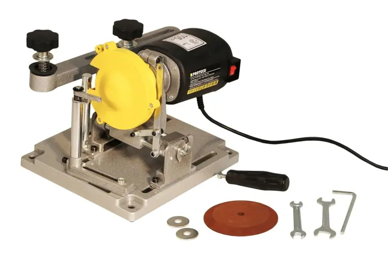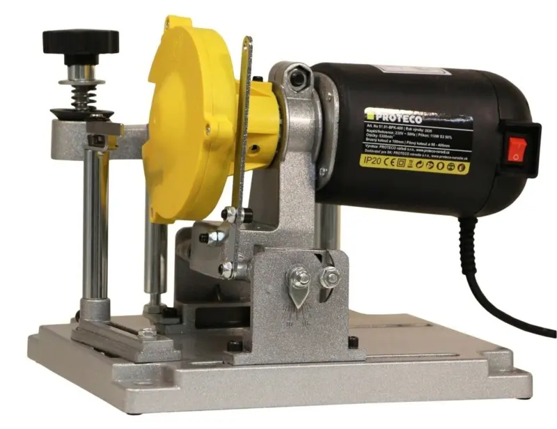 Brúska  pílových kotúčov Proteco je vhodná na ostrenie pílových kotúčov ručných  okružných píl, stolových píl a píl na palivové drevo. Súčasťou brúsky  pílových kotúčov je diamantový kotúč na brúsenie kotúčov s karbidovými plátkami  a keramický kotúč na brúsenie pílových kotúčov z nástrojovej ocele. Brúska  umožňuje nastavenie brúsenia čelnej i zadnej strany priamych alebo striedavo  šikmých zubov, čo zvyšuje životnosť a hospodárnosť pílových kotúčov. Brúsku  poháňa jednofázový, asynchrónny motor, ktorý zaisťuje tichý, bezúdržbový a  bezproblémový chod brúsky.