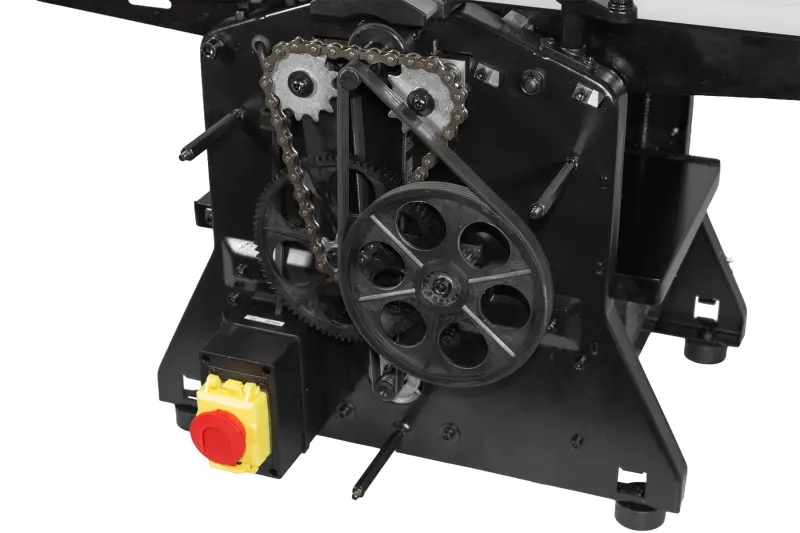 Prenos výkonu je riešený kombináciou remeňového a reťazového prevodu, ktorý zabezpečuje spoľahlivý chod stroja a synchronizovaný posuv materiálu pri preťahovaní.