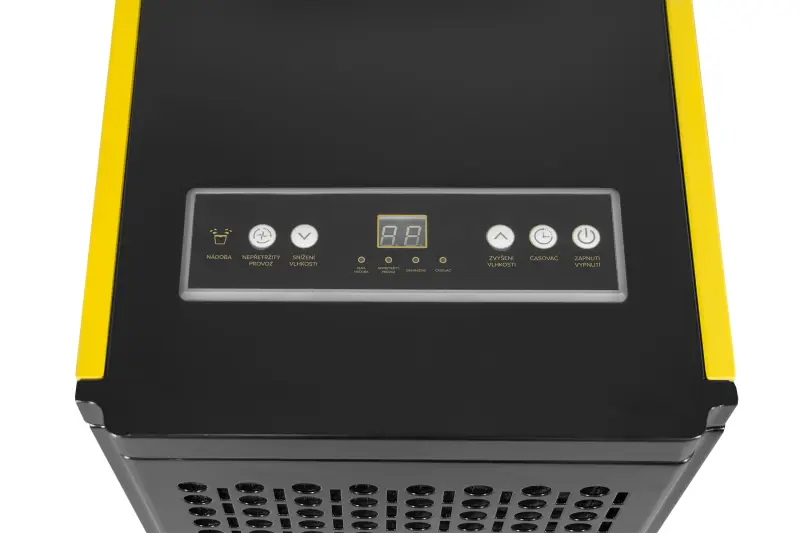 Intuitívny ovládací panel s digitálnym displejom umožňuje presné nastavenie cieľovej vlhkosti v rozsahu 20–90 % RH v krokoch po 5 % RH. Kompresor sa zapína pri odchýlke > 3 % RH, čo zabezpečuje stabilnú a efektívnu prevádzku bez zbytočného cyklovania. K dispozícii je aj režim nepretržitej prevádzky, v ktorom zariadenie pracuje trvalo bez ohľadu na aktuálnu vlhkosť. Tento režim je ideálny pri vysúšaní muriva, najmä po vytopení alebo pri sanácii stavebných konštrukcií. Odvlhčovač je vybavený pamäťou posledného nastavenia, takže pri výpadku napájania automaticky pokračuje v pôvodne zvolenom režime.