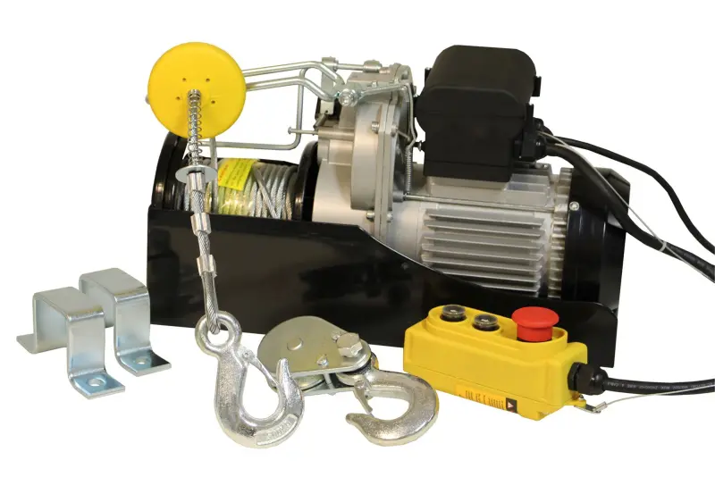 Elektrický lanový naviják Proteco 999/500 kg je vhodný k zvislému zdvíhaniu a spúšťaniu bremien s kladkou alebo bez. Ak použijete kladku, možno zdvíhat náklady s maximálnou hmotnosťou 999 kg do výšky 6 m. Režim bez kladky je určený pre predmety do 500 kg, ktoré zdvihnete do výšky 12 m. Pohon navijáku zabezpečuje asynchrónny motor s príkonom 1 300 W, ktorý je vybavený tepelnou ochrannou. Tá zabezpečí v prípade prehriatia motora jeho odpojenie. Po vychladnutí motora je jeho funkcia opäť obnovená. Motor je vybavený elektromechanickú brzdou, ktorá pri vypnutí el. prúdu ihneď zaistí manipulované bremeno v aktuálnej pozicií. Prevod je zložený z oceľových kalených kolies so stálou tukovou náplňou v hliníkovej skrini. Hriadele sú uložené v guľôčkových ložiských. Na ovládanie navijaku slúži ovládač, ktorý je vybavený kolískovým prepínačom - zdvíhanie a spúštanie bremena a bezpečnostným STOP tlačidlom. Pre zníženie zaťaženia prívodného kábla je ovládač zavesený na oceľovom lanku.