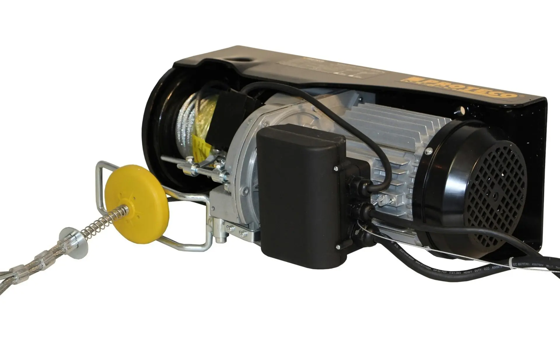 Elektrický lanový naviják Proteco 999/500 kg je vhodný k zvislému zdvíhaniu a spúšťaniu bremien s kladkou alebo bez. Ak použijete kladku, možno zdvíhat náklady s maximálnou hmotnosťou 999 kg do výšky 6 m. Režim bez kladky je určený pre predmety do 500 kg, ktoré zdvihnete do výšky 12 m. Pohon navijáku zabezpečuje asynchrónny motor s príkonom 1 300 W, ktorý je vybavený tepelnou ochrannou. Tá zabezpečí v prípade prehriatia motora jeho odpojenie. Po vychladnutí motora je jeho funkcia opäť obnovená. Motor je vybavený elektromechanickú brzdou, ktorá pri vypnutí el. prúdu ihneď zaistí manipulované bremeno v aktuálnej pozicií. Prevod je zložený z oceľových kalených kolies so stálou tukovou náplňou v hliníkovej skrini. Hriadele sú uložené v guľôčkových ložiských. Na ovládanie navijaku slúži ovládač, ktorý je vybavený kolískovým prepínačom - zdvíhanie a spúštanie bremena a bezpečnostným STOP tlačidlom. Pre zníženie zaťaženia prívodného kábla je ovládač zavesený na oceľovom lanku.