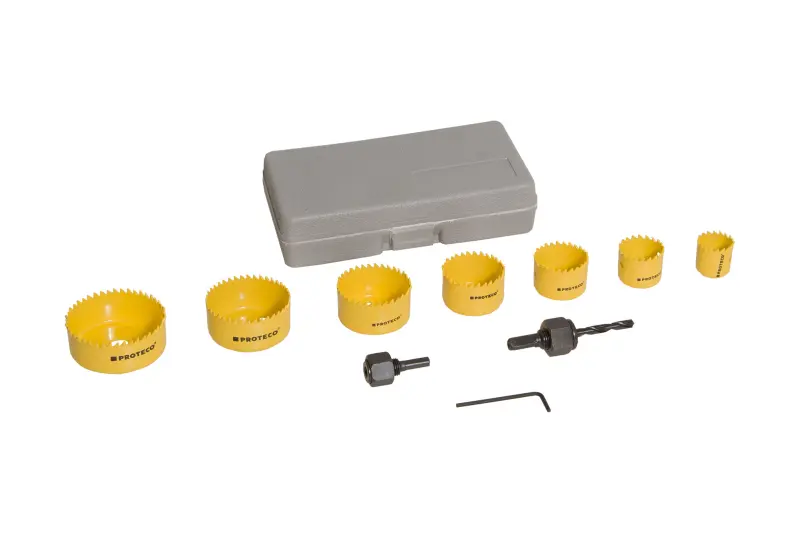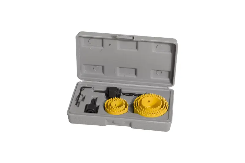 Sada vykružovacia pil z rýchloreznej ocele (HSS) v kufri. Sada je určená pre vŕtanie do mäkkého aj tvrdého dreva a sadrokartónu. Súčasťou sady je aj držiak vykružovací píl so šesťhrannou stopkou.