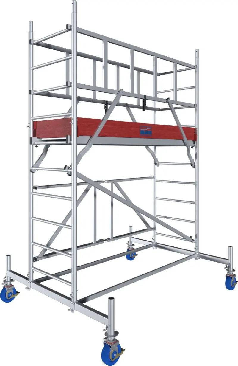 Rychle smontovatelné a snadno přepravovatelné aluminiové skládací lešení s brzděnými pojezdovými koly do interiéru a exteriéru.