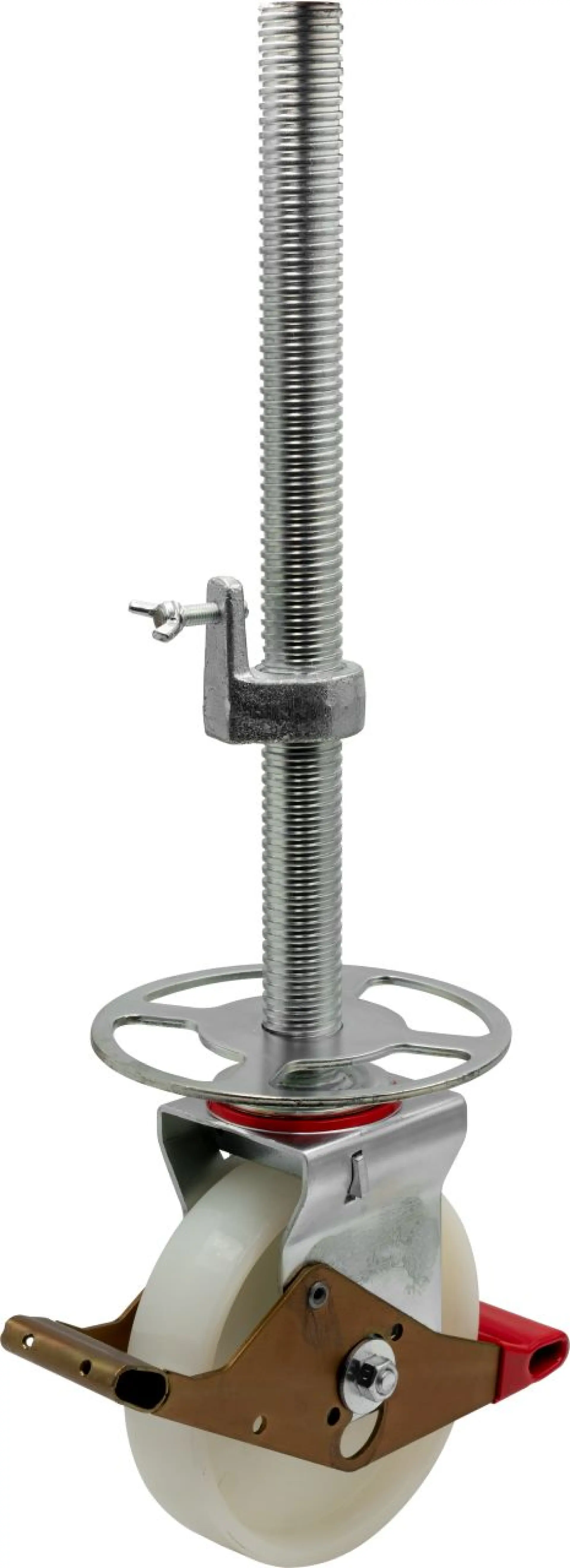 Výškovo nastaviteľné kolieska Ø 200 mm so skrutkovým mechanizmom umožňujú vyrovnanie aj na nerovnom podklade. Pre vyššie konfigurácie (od cca 7,50 m) sa používajú teleskopické výložníky pre bezpečnú stabilizáciu.