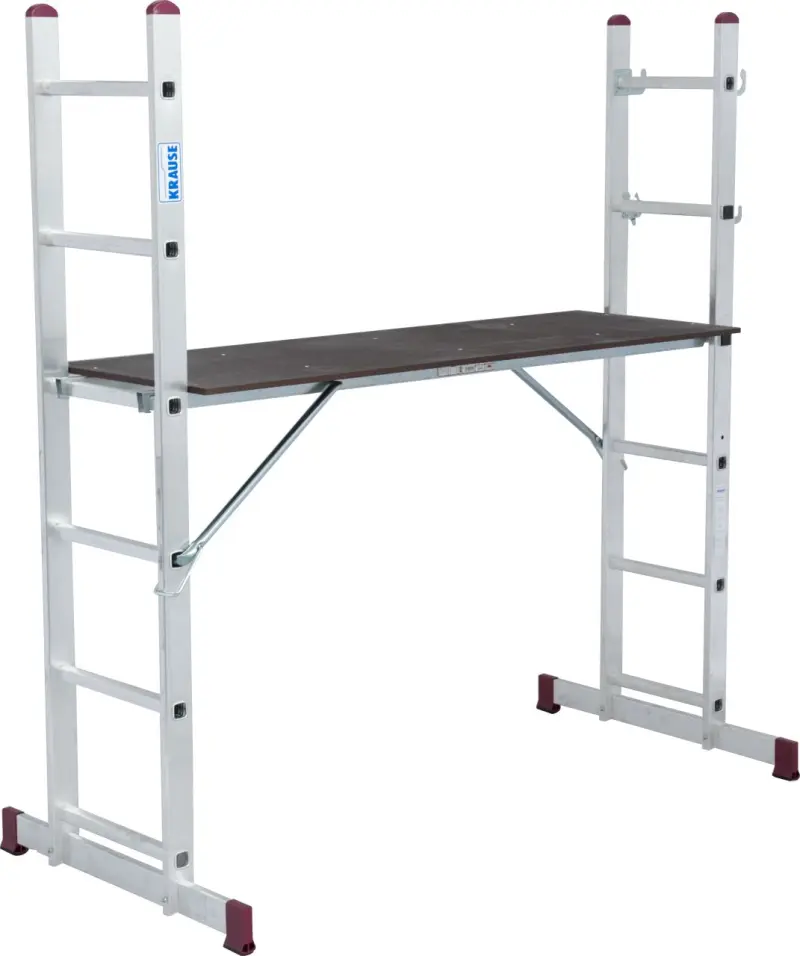 Lešení KRAUSE 2x6 je šikovné malé multifunkční hliníkové lešení, které vám nabízí různé možnosti použití. Můžete ho sestavit jako lešení s pracovní výškou až 3 m, jako štafle nebo jako opěrný žebřík s pracovní výškou až 3,75 m. Lešení se skládá ze dvou 6-stupňových žebříků se stabilizátory a samonosné pracovní plošiny s protismykovým a voděodolným povrchem. Konstrukce je tvořena z robustních hliníkových profilů s nosností 150 kg, tudíž lze na něm pohodlně pracovat s dostatkem materiálu a nářadí. Samozřejmostí je certifikace normou EN 131.