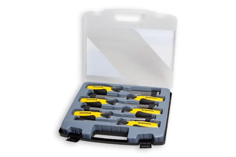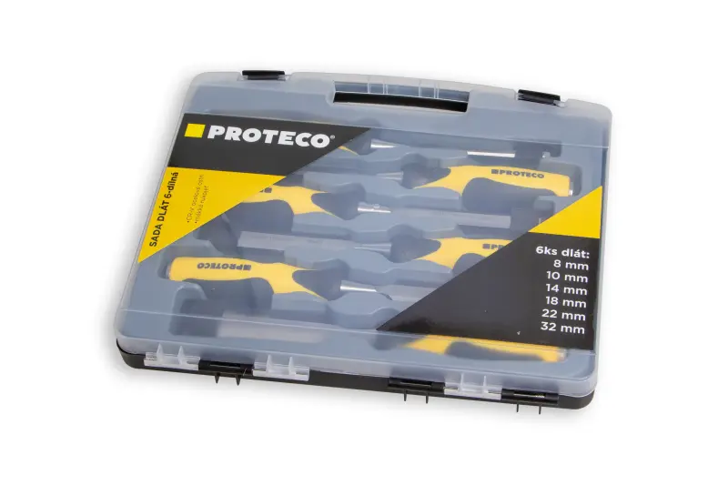 Sada dlát PROTECO vyrobených z kvalitnej CrV ocele zaručujúca vysokú a presnú kvalitu spracovania. Súprava obsahuje 6 ks dlát (8, 10, 14, 18, 22, 32 mm). Mäkčená rukoväť zaisťuje pohodlnú a dlhotrvajúcu prácu s pevným úchopom. Čepele sú presne brúsené pre maximálnu ostrosť. Dláta disponujú poniklovanou oceľovou údernou plochou, ktorá je pevná a odolná.