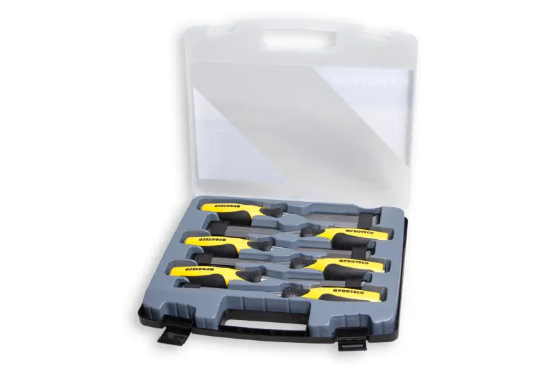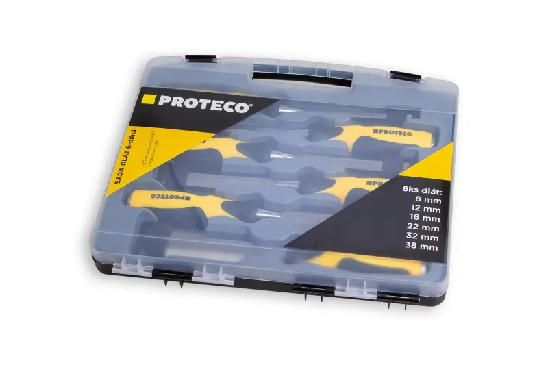 Sada dlát PROTECO vyrobených z kvalitnej CrV ocele zaručujúca vysokú a presnú kvalitu spracovania. Súprava obsahuje 6 ks dlát (8, 12, 16, 22, 32, 38 mm). Mäkčená rukoväť zaisťuje pohodlnú a dlhotrvajúcu prácu s pevným úchopom. Čepele sú presne brúsené pre maximálnu ostrosť. Dláta disponujú poniklovanou oceľovou údernou plochou, ktorá je pevná a odolná.