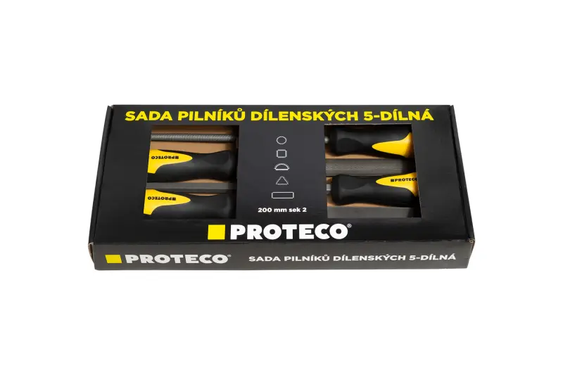 - Sada pilníkov 5-dielna obsahuje pilníky sek 2 200 mm: plochý, úsečový, trojhranný, štvorhranný, kruhový