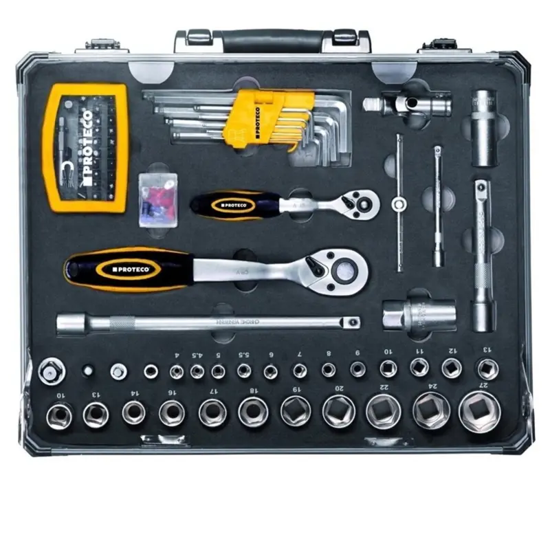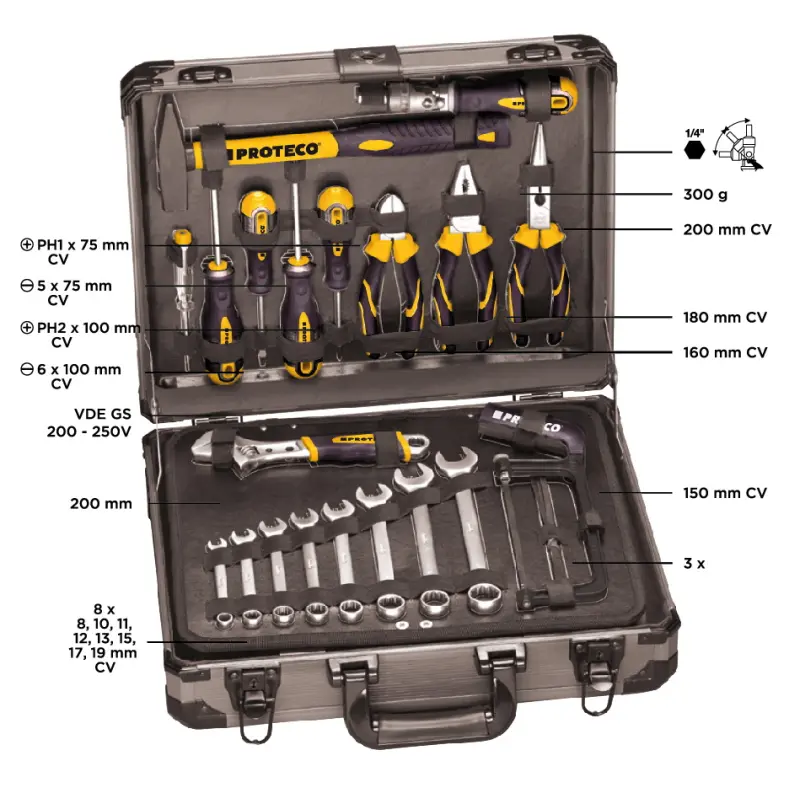 Sada náradia v kufri 129 dielov obsahuje široké portfólio náradie, ktoré sa hodia pre bežnú údržbu v dielni, dome i na cestách. Sada obsahuje základný náradia v počte 129 dielov. Sada je uložená v kvalitnom kovovom kufri a jednotlivé náradia je fixované, aby sa pri transporte nehýbalo a ostalo na svojom mieste.