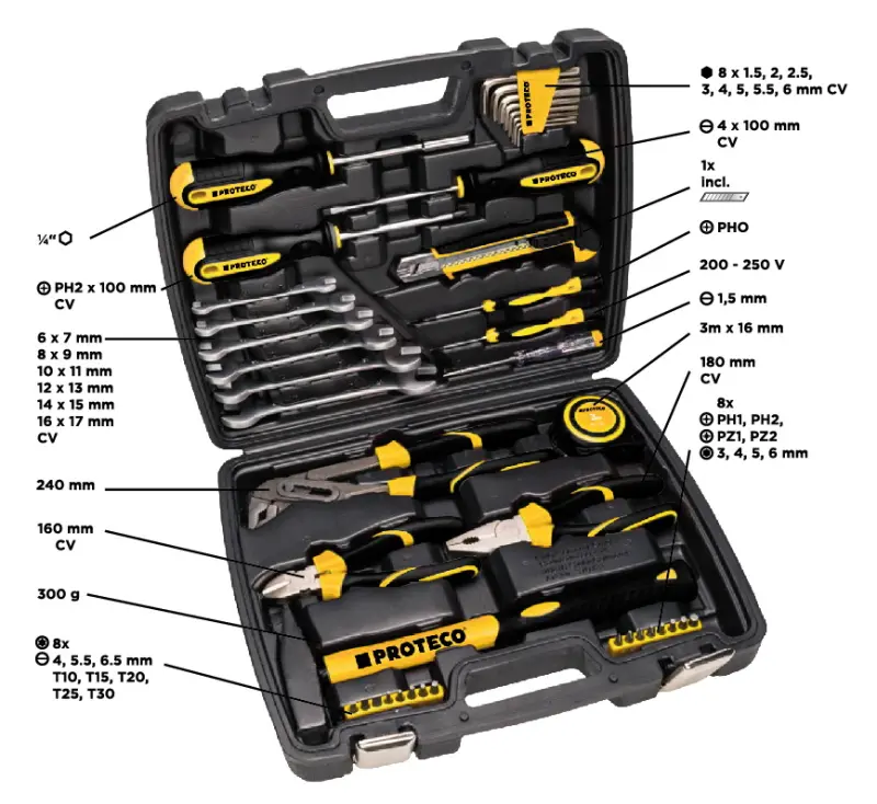 Sada na náradia v kufri 42 dielov obasuje základné náradie, kroté sa hodia pre bežnú údržbu v domácnosti, dielni aj okolo domu.