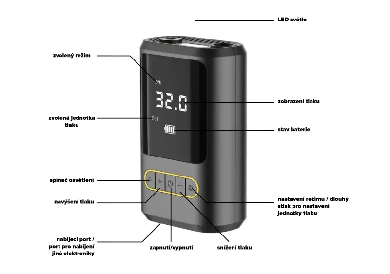 Okrem detekcie tlaku v pneumatikách a vzduchového kompresora ponúka tento praktický pomocník aj ďalšie praktické funkcie. Zariadenie má LED svetlo s niekoľkými možnosťami osvetlenia. Biele svetlo možno použiť buď ako baterku/lampu, alebo aj ako predné svetlo na bicykel v krajnej núdzi. Režim červeného výstražného svetla možno zase použiť ako výstražné svetlo zadného bicykla. Zariadenie sa dá použiť aj ako powerbanka, takže si môžete na cestách nabíjať napríklad mobilný telefón alebo inú drobnú elektroniku.