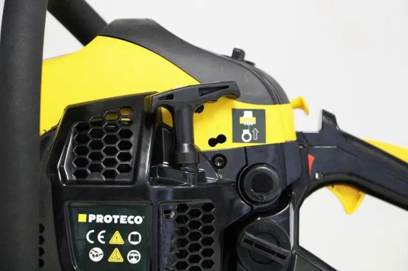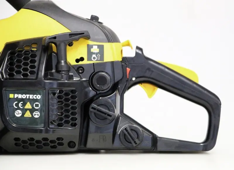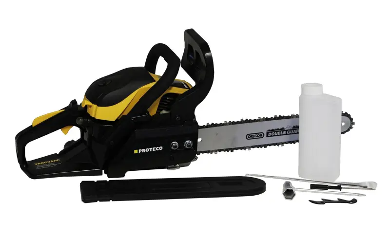 Benzínová reťazová píla Proteco je ideálnym pomocníkom na rezanie dreva s malým a stredným priemerom, vetvenia, prerezávanie, rezanie palivového dreva atď. Úspešná kombinácia vysokorýchlostného dvojtaktného motora s výtlakom 37,2 cm ³ a výkonom 1,2 kW robí z motorovej píly veľmi populárne pohodlie a kompaktného pomocníka pre každého vášnivého pomocníka alebo záhradníka. Reťazová píla má 35 cm koľajnicu a oregonský reťazec na plnenie aj najnáročnejších úloh. Motor je chránený nielen proti nárazu montážou tichýchblokov a plastových krytov, ale aj, pokiaľ je to možné, bez vibrácií a hluku. Optimálne napätie pílovej reťaze je možné ľahko nastaviť pomocou skrutky na bočnej strane reťazovej píly.