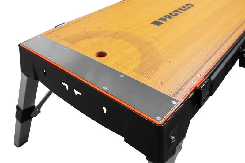 Skladá sa z ľahko vymeniteľného obojstranného stola. Na jednej strane je doska z MDF dreva potrebná na prácu s pracovným stolom, na ktorej je aj uhlomer, pravítko na meranie a dierovač na dierovanie otvorov s priemerom až 30 mm bez vŕtania samotnej dosky. Druhá strana dosky je vyrobená z polypropylénového plastu, čo znamená, že sa dá ľahko umývať a čistiť, takže je ideálna na prepravu alebo na funkcie odvodnenej plošiny. Kombinovaná konštrukcia poskytuje používateľovi ľahkosť aj robustnosť. Konštrukcia sklopných nôh umožňuje jednoduché vysunutie. Stôl je vybavený výstuhou z nehrdzavejúcej ocele na prácu a zabraňuje poškodeniu pracovnej dosky.