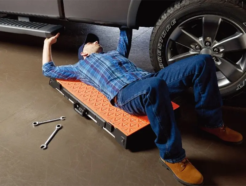 Vďaka výsuvným nohám a štyrom kolieskam možno pracovný stôl ľahko premeniť na mobilné ležadlo. Dve kolieska sa dajú otáčať o 360°. To umožňuje prácu na ťažko prístupných miestach, napríklad pod automobilmi alebo inými nízko položenými vozidlami, čo uľahčuje údržbu a opravy na podvozku. Lehátko tak umožňuje pracovať na rôznych projektoch a zároveň zaručuje maximálnu mobilitu a flexibilitu pre vaše potreby.