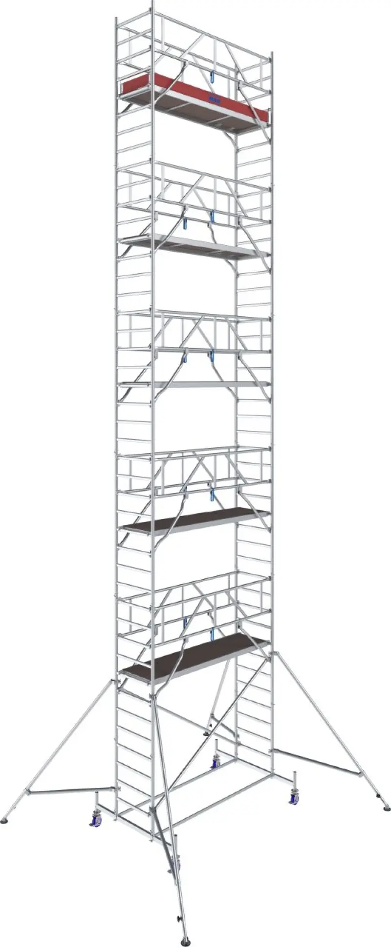 Od výšky 4,40 m sú súčasťou oceľové stabilizátory, od 7,40 m potom aj teleskopické výložníky s nastaviteľnými pätkami pre vyššiu stabilitu. Kolieska s nastaviteľnou výškou (Ø 150 mm) uľahčujú presun aj prácu na nerovnom teréne.