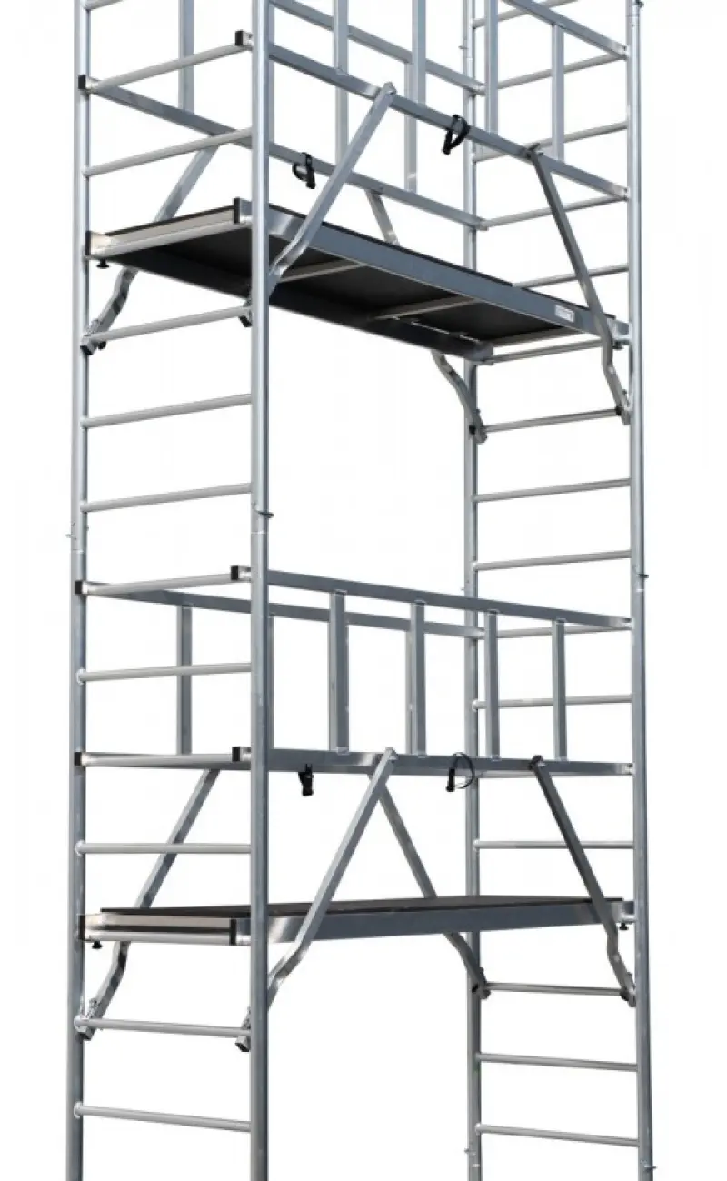 Lešenie je pojazdné a skladné – zábradlový rám sa dá jednoducho zložiť pre prepravu či uskladnenie.