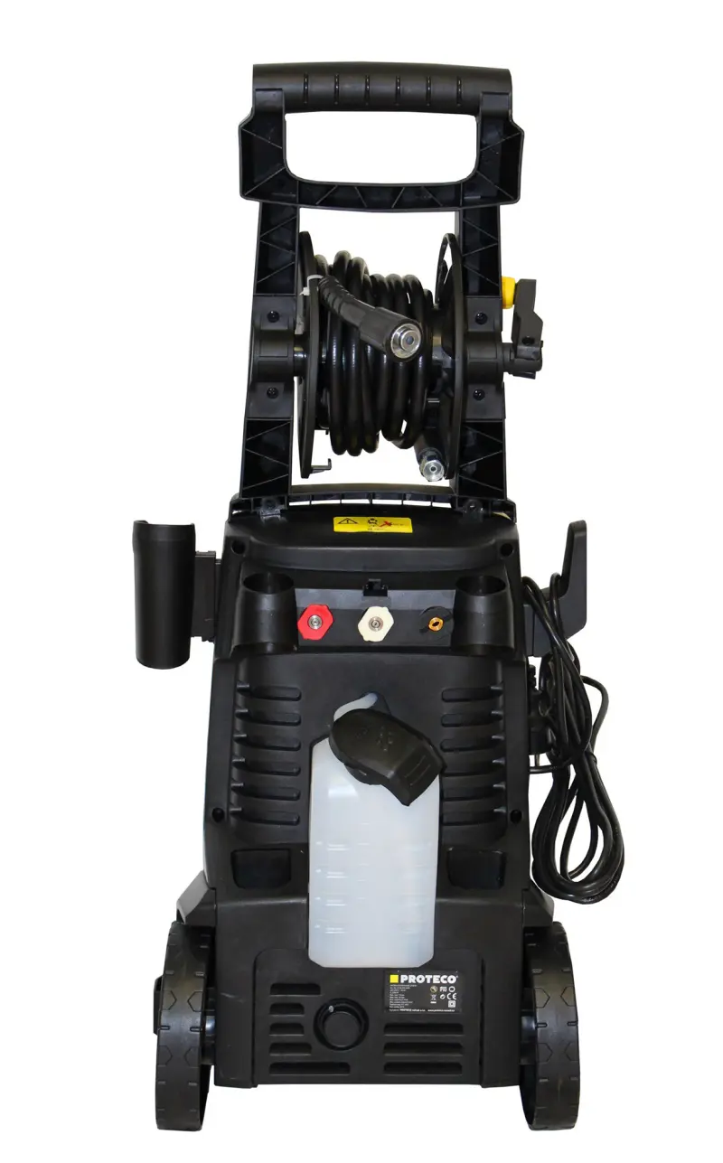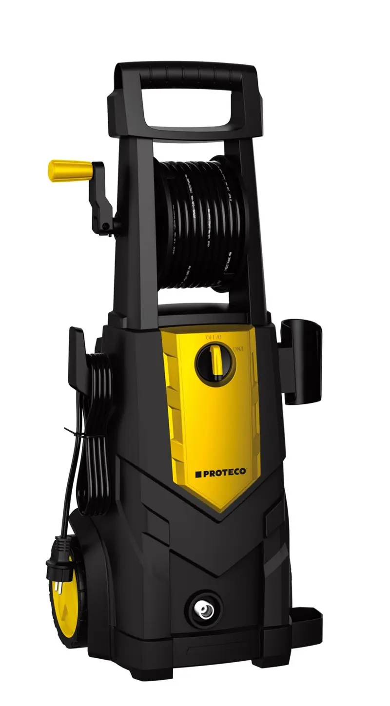 Vysokotlaká umývačka Proteco 2 000 W je určená na umývanie ťažko odstraniteľných nečistôť z vozidiel, záhradnej techniky, chodníkov, strojov a pod. Pomocou čistej vody a umývacích prostriedkov na tento účel určených. Možno ju využívať aj na čistenie zaneseného odpadového potrubia pomocou špeciálnej hadice. Teplota vstupnej vody môže byť až 50°C. Umývačka je osadená výkonným jednofázovým asynchrónnym motorom a axiálnym čerpadlom s mosadznou ventilovou hlavou. Pištoľ je vybavená rýchloupínacou koncovkou a držiakom so sadou trysiek. Výhodou týchto trysiek je presné formovanie lúča bez straty výkonu, veľmi ľahké čištenie v prípade upchatia, rýchla montáž a demontáž. Umývačka je krem iného vybavená aj navíjacím bubnom s tlakovou hadicou, držiakom pištole a závesom prívodného kábla.