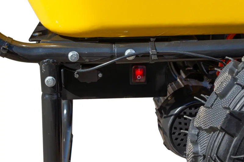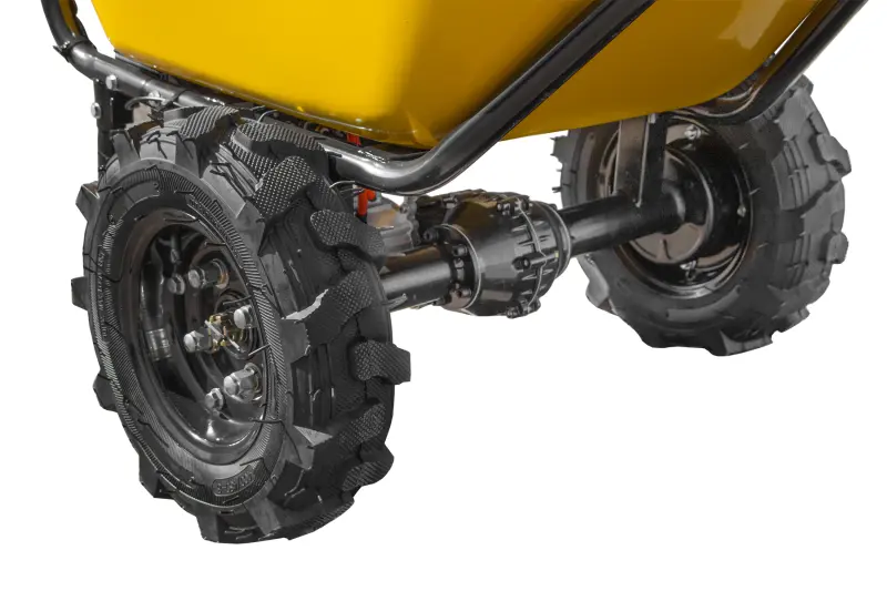Dvoukolejová konstrukce zajišťuje výbornou stabilitu i při maximálním zatížení. Široká nafukovací kola se šípovým dezénem si poradí s nerovným, měkkým i kluzkým povrchem. Motor umístěný na přední ose rovnoměrně rozkládá váhu, čímž snižuje námahu při manipulaci.