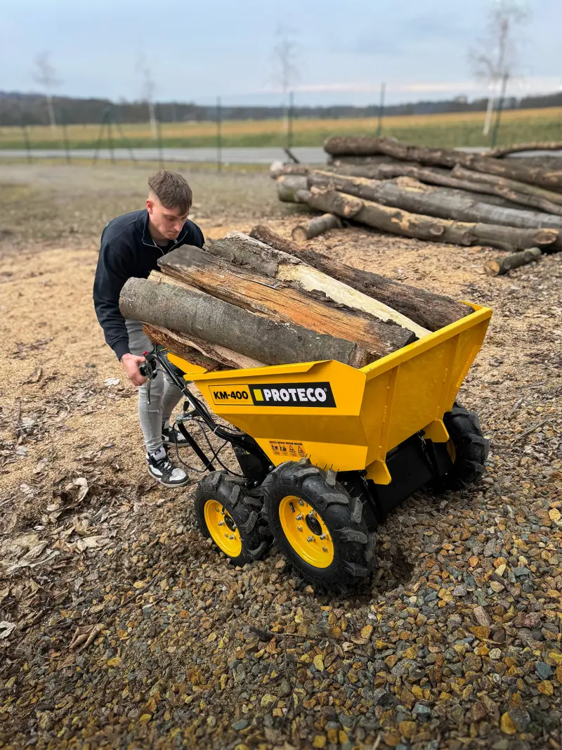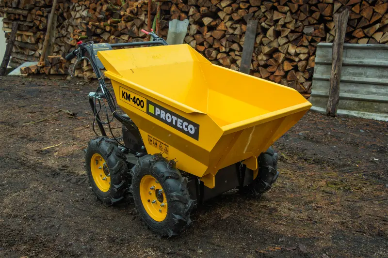 Motorový dumper PROTECO je neoceniteľným pomocníkom na stavbe, v poľnohospodárstve, lesníctve aj pri úprave záhrady. Vďaka nosnosti 400 kg bez námahy prevezie ťažký náklad aj v extrémnych podmienkach. Výkonný benzínový motor 6,5 HP (196 cm³) v kombinácii s pohonom všetkých kolies (4×4) hravo prekonáva svahy (až do 20°), blato a nerovnosti, zatiaľ čo široké kolesá chránia podklad a zvyšujú stabilitu.