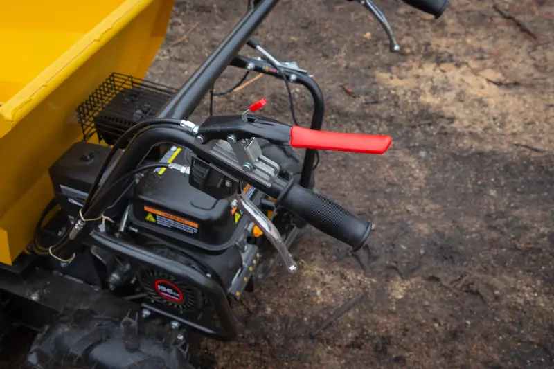 Obsluha dumpera je maximálne intuitívna. Páčky na rukoväti umožňujú jednoduché riadenie, pridávanie plynu a zastavenie. Trojstupňová prevodovka + spiatočka zaisťuje plynulú jazdu, pričom automatická brzda sa aktivuje pri uvoľnení plynu, takže máte vždy plnú kontrolu nad strojom.