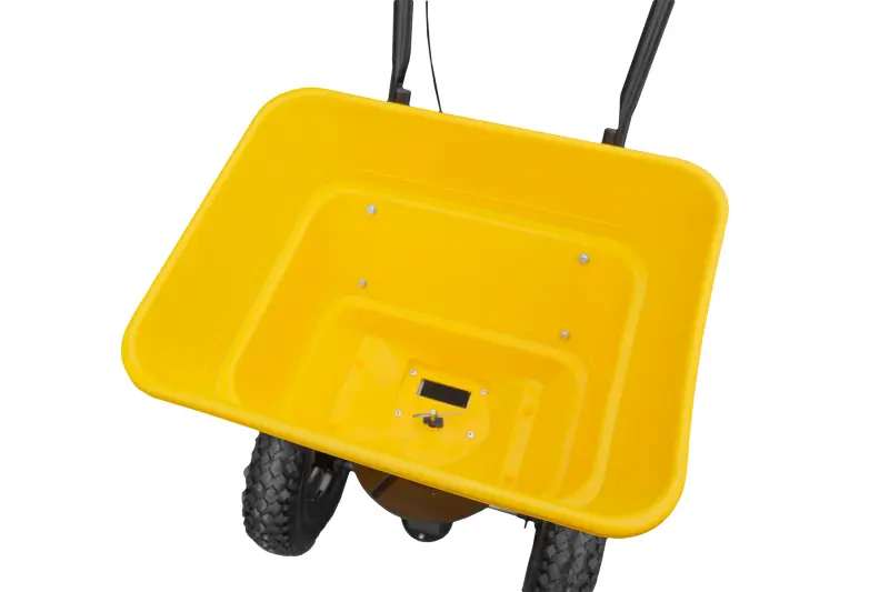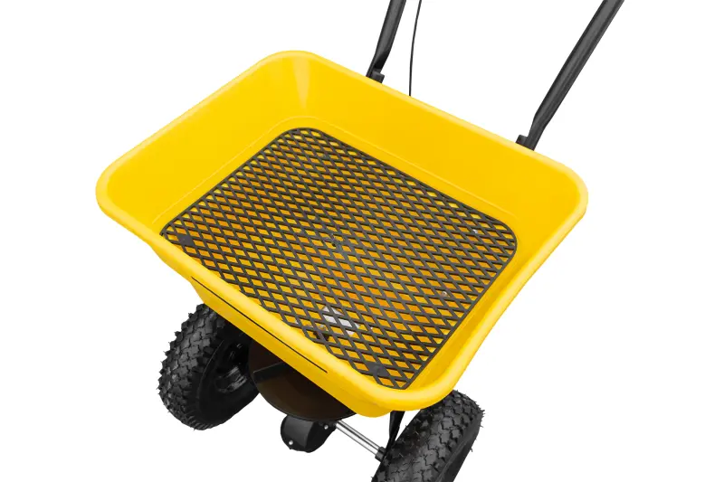 Odolná násypka z PVC je ľahká, nepodlieha korózii a veľmi jednoducho sa udržiava. Po použití ju stačí jednoducho opláchnuť, čo oceníte najmä pri striedaní rôznych materiálov alebo po zimnom posype soľou. Hladký povrch násypky zabraňuje usadzovaniu zvyškov materiálu a uľahčuje jej čistenie aj po náročnej prevádzke. Robustný oceľový rám dodáva vozíku potrebnú pevnosť a stabilitu pri práci. Konštrukcia je navrhnutá tak, aby bez problémov zvládala plne naloženú násypku a dlhodobé používanie bez straty tuhosti.